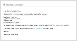 So now all we have to do is wait between a week and two weeks for the ladies and gentlemen at Apple to make sure we haven’t made some horrible dirty willy bum-bum simulator or something.