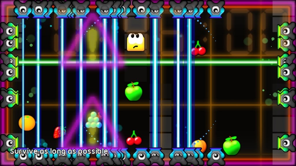 Deep in the electro-abyss lives a little robot who loves to eat exploding fruit. He also likes staying alive. That’s where you come in… Get the fruit. Avoid the enemies. Try not to die. (Spoilers: you will die).